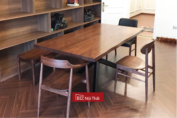 Bộ sản phẩm được làm từ gỗ óc chó tự nhiên đã qua tẩm sấy chống mối mọt, gỗ được sơn màu tự nhiên, bóng mịn, thơm mùi gỗ. Mỗi chiếc ghế đều được bọc đệm màu xám êm ái, dễ lau chùi. Đặc biệt, các cạnh bàn đều được mài tròn nhẵn, không có tính sát thương ngay cả khi những đứa trẻ có đùa nghịch mà vô tình va phải, rất an toàn.