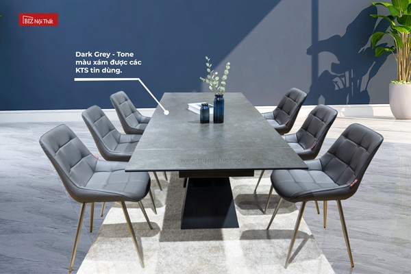 Sản phẩm được cấu tạo từ mặt đá Ceramic kết hợp với khung kim loại cao cấp. Phần mặt bàn màu xám gray sang trọng, bề mặt láng mịn, có khả năng chống ố, chống thấm hiệu quả, đảm bảo cả độ cứng cáp lẫn tính thẩm mỹ của sản phẩm. Đặc biệt, hạn chế bám dính bụi bẩn và dễ dàng lau sạch.