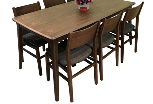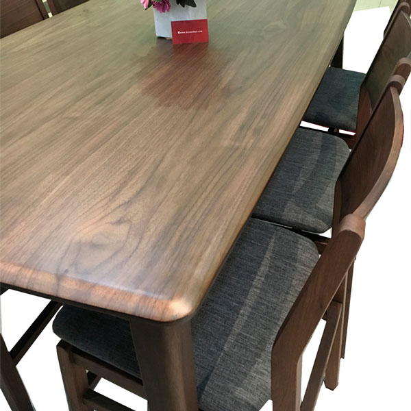 Bộ sản phẩm được làm từ gỗ óc chó tự nhiên đã qua tẩm sấy chống mối mọt, gỗ được sơn màu tự nhiên, bóng mịn, thơm mùi gỗ. Mỗi chiếc ghế đều được bọc đệm màu xám êm ái, dễ lau chùi. Đặc biệt, các cạnh đều được mài nhẵn, không có tính sát thương ngay cả khi những đứa trẻ có đùa nghịch mà vô tình va phải, rất an toàn.