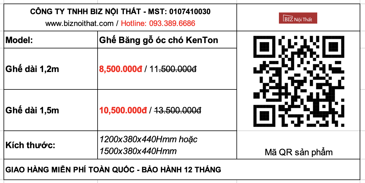Kích thước: Ghế Băng: 1200 x 380 x 440mm hoặc 1500 x 380 x 440mm