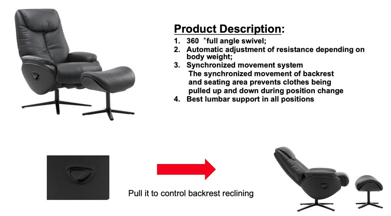 8. Đôn có thể điều chỉnh góc nghiêng hoặc khoá cố định trong phạm vi từ 0° đến 15° (Ottoman adjustable range:15°, Ottoman automatically lock)