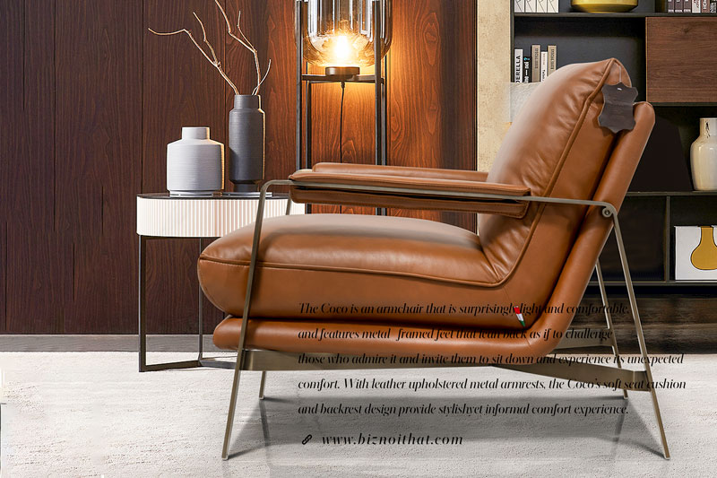Ghế thư giãn da thật italy Coco mang phong cách thiết kế Italia được là một chiếc ghế bành nổi tiếng mang phong cách hiện đại, phần khung mang hình dáng của chiếc xe trượt tuyết, sử dụng vật liệu inox màu đồng nhạt không gỉ.