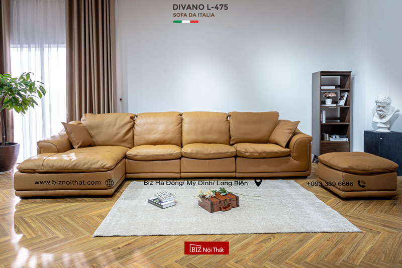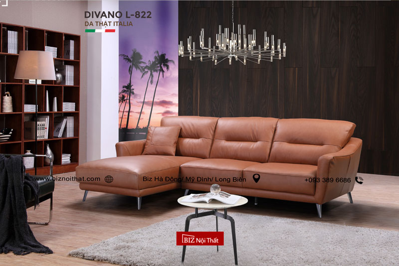 9. Bộ Sofa chất liệu da bò Ý nhập khẩu Divano L-822 màu da bò dài 2,8m: Sofa làm bằng da bò Italia, Chỉ dùng 100% da thật cho toàn bộ phần tiếp xúc. Da Top Leather dày 1,3-1,5mm, khung gỗ tự nhiên, đệm mút ngồi cao cấp.
