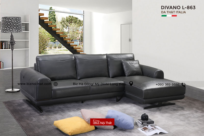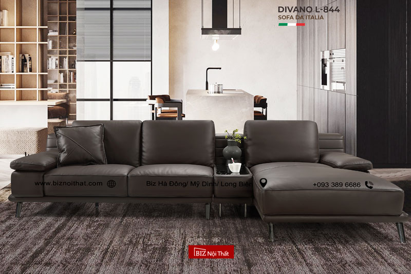 2. Sofa da văng 3 chỗ chất liệu da bò Ý Divano L-844: Sử dụng 100% nguyên liệu từ Italy, trong đó da bò thật Mastroto đến từ Italia - hãng sản xuất da thật số 1 Italia